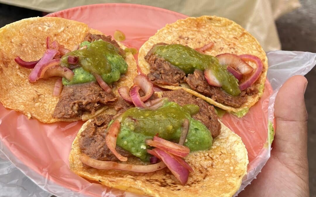 Tacos de Canasta de chicharrón prensado, papa, frijol y adobada es lo que puedes encontrar en los Chalpatacos, con su clásica tortilla amarilla y que mantienen calientitos en una hielera para que estén siempre en su punto.
