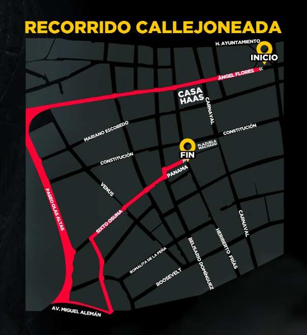 El recorrido de la callejoneada será por la calle Ángel Flores hasta llegar a Olas Altas para dar vuelta en el escudo por la calle Miguel Aleman , vuelta a la derecha en Venustiano Carranza hasta la calle Sixto Osuna para continuar derecho para topar con la Plazuela Machado en donde termina la callejoneada y comienza una serie de espectáculos