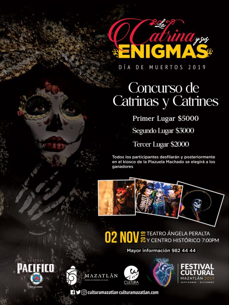 Se realizara un concurso de Catrinas y Catrines por parte de cultura Mazatlán con un premio de 5,000 pesos para el primer lugar. Necesitas inscribirte previamente en el Instituto de Cultura y el día 2 de noviembre presentarse en el Patio Central de Palacio Municipal a las 7:00 pm con Gabriela Hernandez.