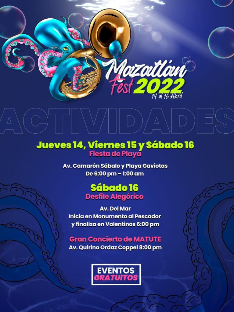 Desde el jueves 14 hasta el Sábado 16 de abril en Avenida Camarón Sábalo y Playa Gaviotas, (En el terreno atrás de donde estan los puestos de Hot Dogs) se realizaran conciertos donde se presentaran artistas como “Abismo Norteño”, “Banda el Bello Puerto de Mazatlán”, “Mary Jose Sarabia”, y más amenizarán la tarde y noche, desde las 6:00 pm a 1:00 am. para que disfrutes de la música en vivo desde la playa en este festival.