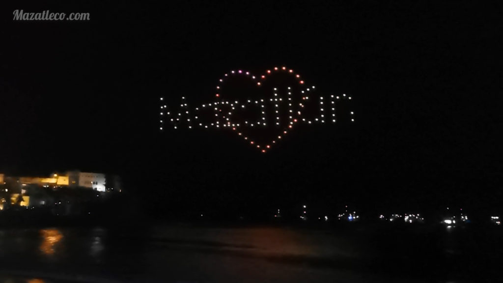 Las expresiones de sorpresa no se hicieron esperar durante el espectáculo que fueron cambiando de forma y color las formaciones mostrando el nombre de Mazatlán rodeado con un corazón, carnaval 2020 y varias mas que ilumaban la bahía de olas Altas de colores.