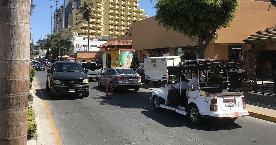 En plena temporada vacacional con una gran presencia de autobuses algunas partes de la zona dorada se han convertido en un cuello de botella que no permite avanzar a los automóviles, pulmonías y aurigas con turistas sobre ellos.