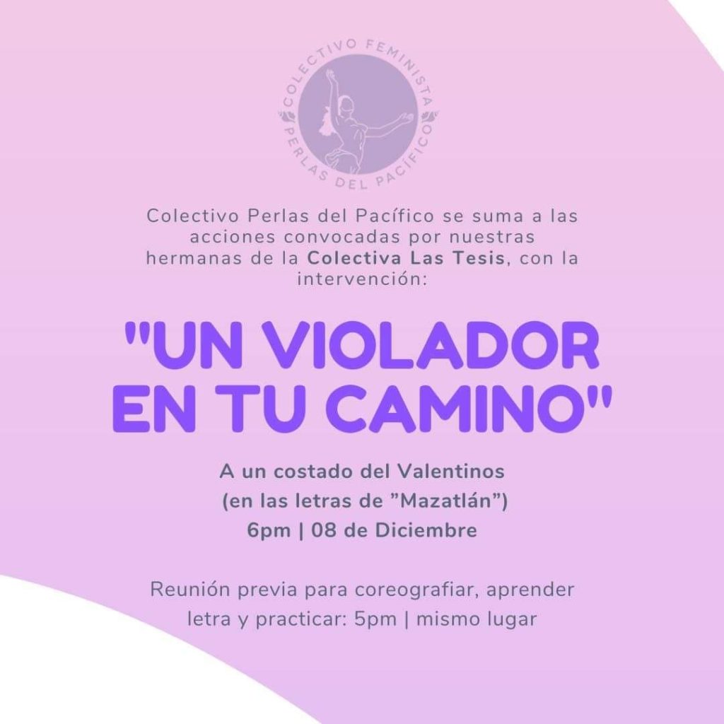 El colectivo feminista Perlas del pacifico sumándose a las acciones que ya se han replicado en muchas ciudades del mundo convoca a las mujeres que se quieran unir a participar en la intervención “Un violador en tu camino” el domingo 8 de diciembre de 2019.