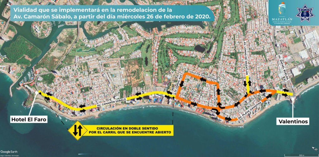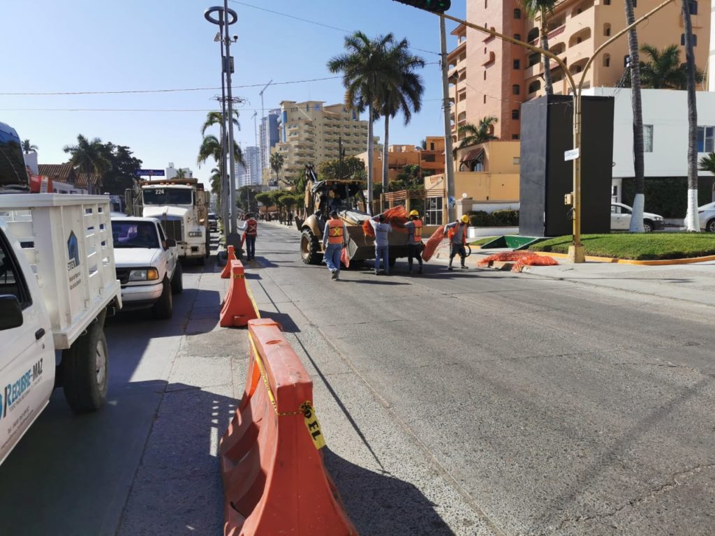 Se comenzará con el carril del lado de la playa (el que esta pegado a la mayoría de los hoteles) por lo que para permitir la movilidad se habilitara en una sección circulación de los 2 sentidos desde av. Gabriel Ruiz ( donde esta Ricos Café y The Inn at Mazatlán hasta el Hotel El Faro.