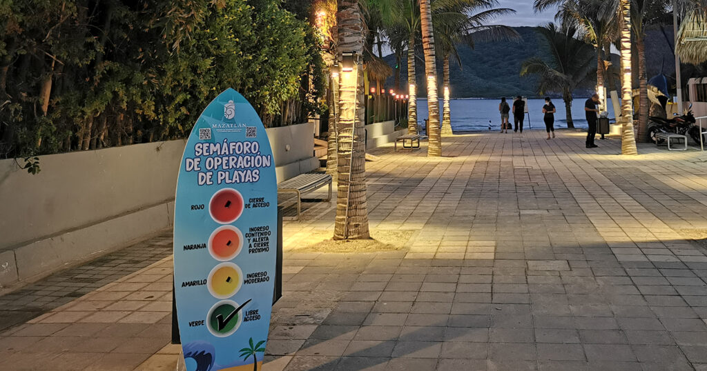 En las playas de Mazatlán se colocaran semaforos y control de acceso en las entradas para controlar la cantidad de personas que se encuentran en cada una de las playas del puerto, esto es con la finalidad de mantener la sana distancia entre grupos de personas que ahí se encuentran.