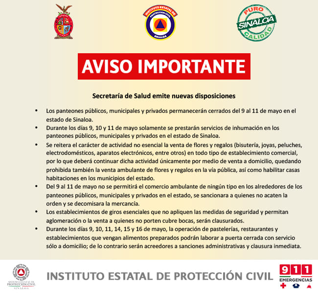 En un comunicado del instituto estatal de protección civil se informo que los días 9, 10 , 11 , 14 , 15 y 16 de mayo los restaurantes, pastelerías y establecimientos que vendan alimentos preparados solo podrán operar a puerta cerrada y  vender mediante servicio a domicilio de lo contrario serán acreedores a una sanción y clausura inmediata.