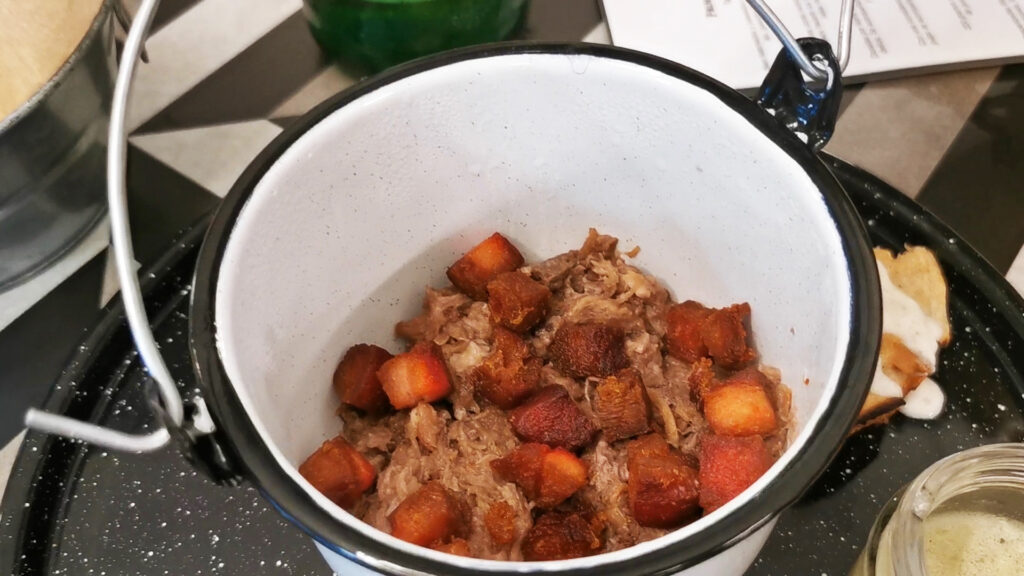 Ademas de este mitico taco, también vende asado de pulpo, su crema de Almejas (Clamp chowder) con un panini que gotea queso volando sobre el, el aguachile fino con tripa dorada y camarón que nos mezcla dos texturas de una gran manera.