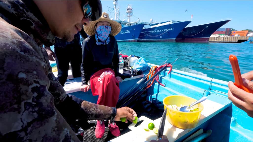 Como buen día de pesca en Mazatlán, la jornada no podía terminar sin el festín. Tras una mañana pesada, los pescadores prepararon un ceviche fresco directamente en la lancha.