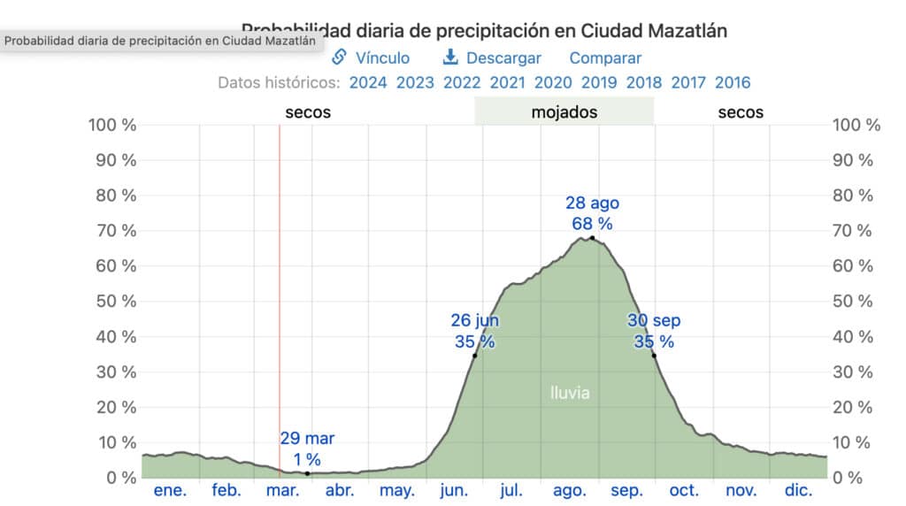 Mazatlán es un lugar donde las probabilidades de lluvia se acumulan durante 4 meses desde mediados de Junio hasta octubre siendo Agosto el mes con las temperaturas más altas pero también con la mayor probabilidad de lluvia.